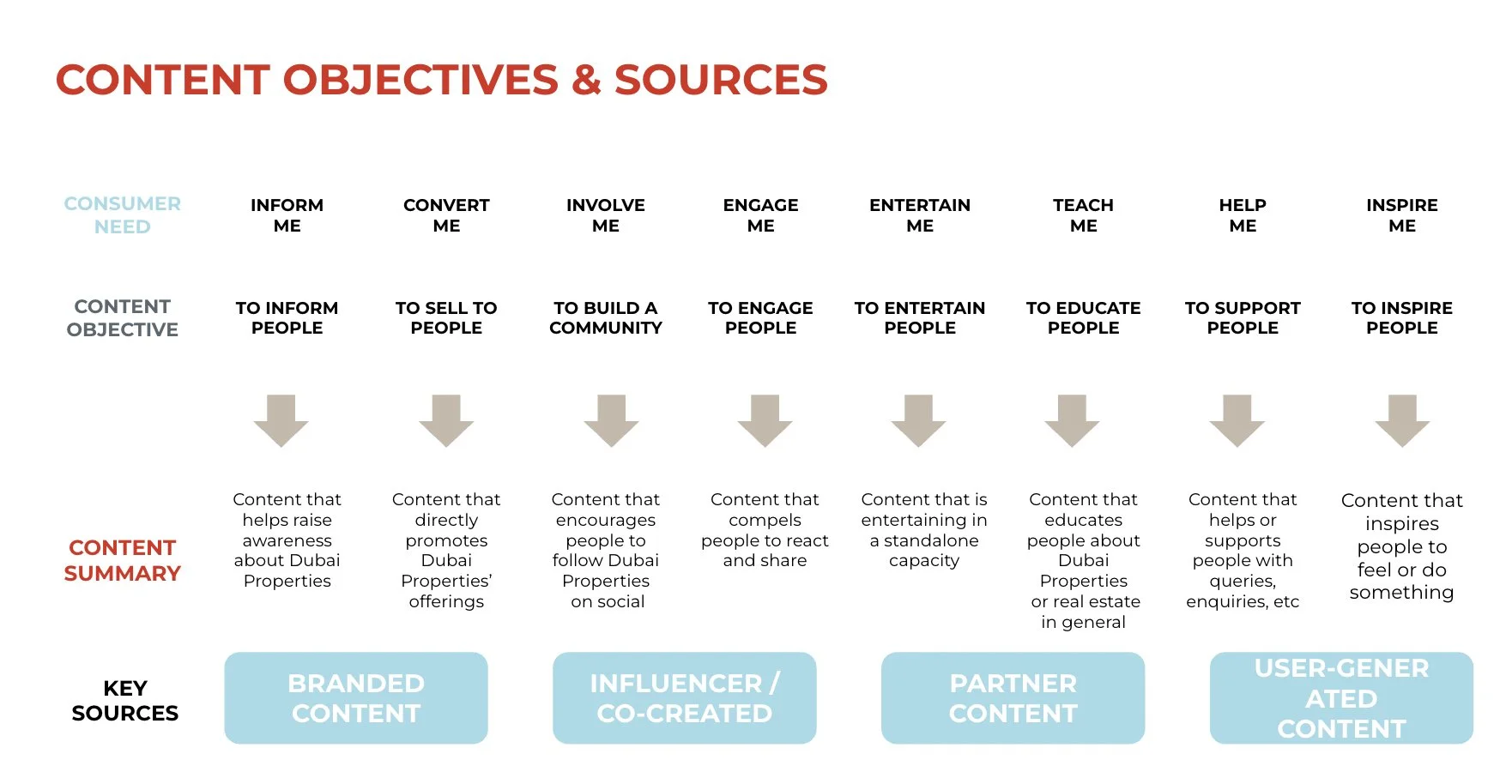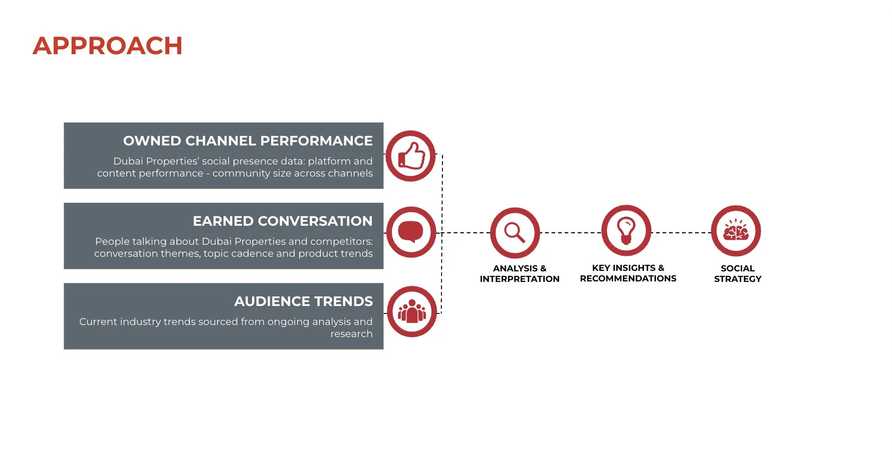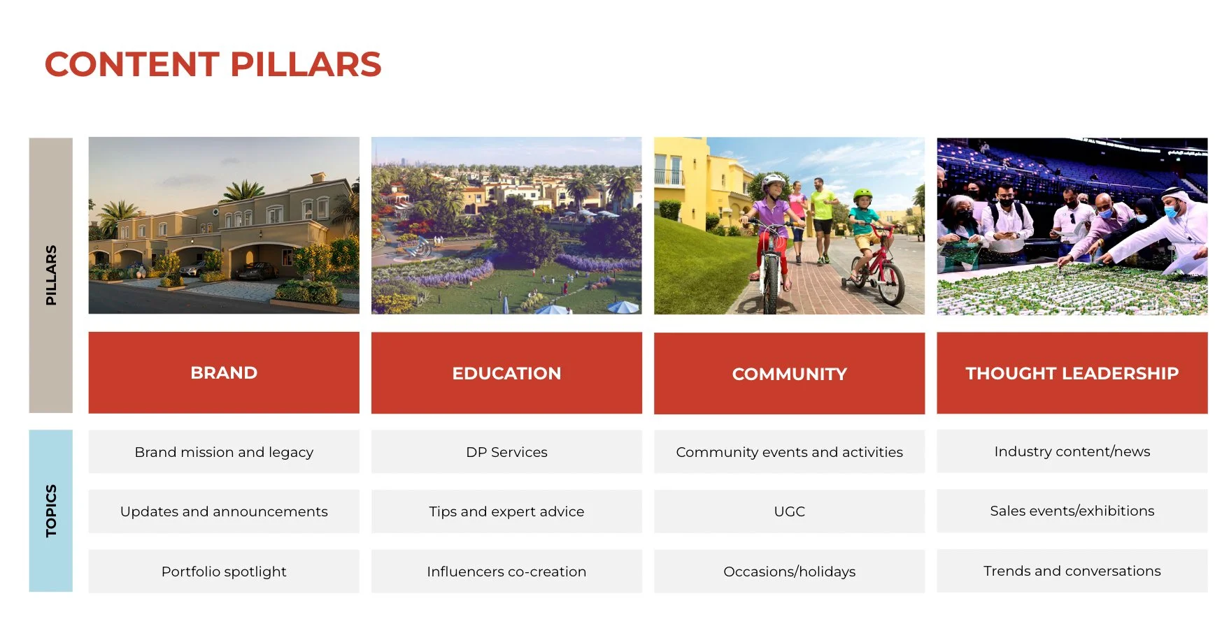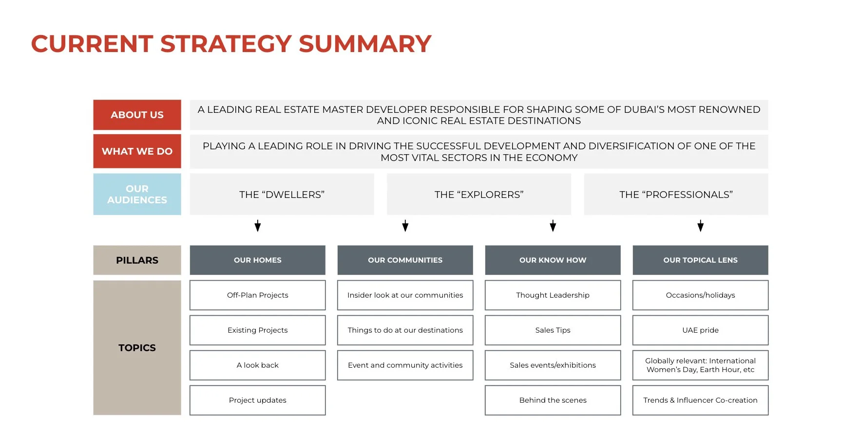 The 2023 strategy integrated a thorough comprehension of business objectives with data and insights derived from content performance across various platforms. This strategy was inherently dynamic, accommodating ongoing modifications throughout its execution. The primary aim was to organically enhance performance across all metrics and platforms. A key emphasis of this strategy was on reinforcing Dubai's reputation as a premier residential destination, aligning our efforts to position the city at the forefront of potential residents' minds.